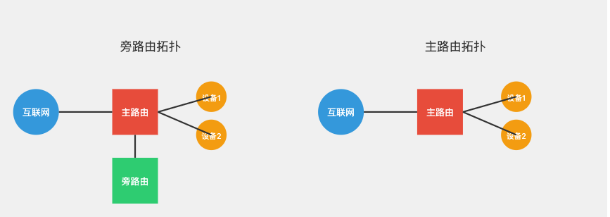 下面是旁路由模式和主路由模式的网络拓扑对比: