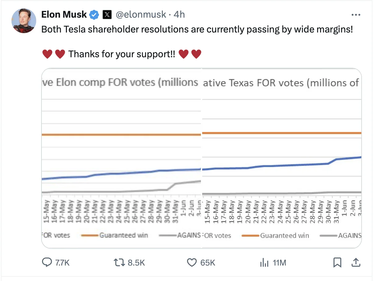 特斯拉CEO马斯克今天在其社交媒体上宣布,特斯拉的两项股东决议目前均获得大幅通过。