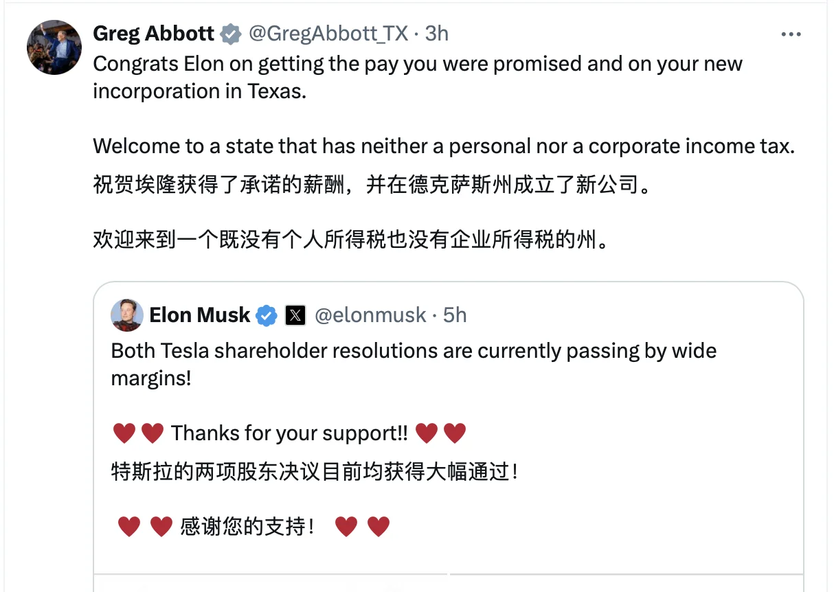 与此同时,这两项表决的通过引发广泛关注,包括德克萨斯州州长阿博特等巨量人群表达对马斯克的祝贺和支持。
