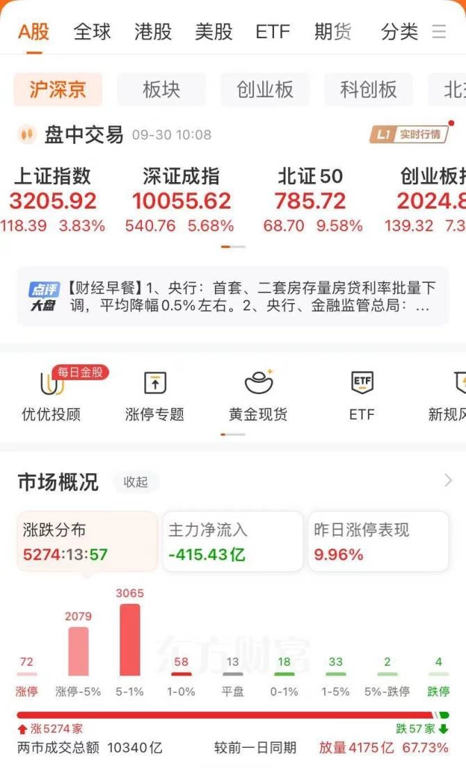 9月30日,两市股指大幅高开,盘中强势拉升。沪指盘中一度涨约6%突破3250点,创一年新高;深证成指涨超7%,创业板指、科创50指数暴涨约9%,北证50指数涨超10%。场内超5300股飘红,仅约30股飘绿。截至发稿,沪指涨逾3%,深证成指涨逾4%,创业板指涨逾5%。数据显示,开盘35分钟,沪深两市成交额连续第4个交易日突破1万亿元,较上一交易日放量超4000亿元,刷新历史最快万亿纪录。