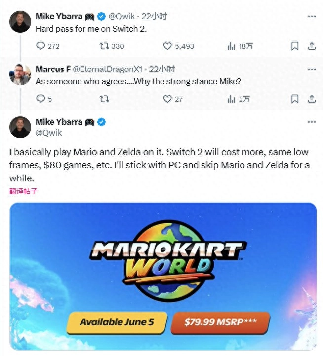 Mike Ybarra发推称,他个人很难接受Switch 2主机。在回答网友提问时,他给出了解释:“我在Switch 2上基本上只玩《马里奥》和《塞尔达传说》。Switch 2花的钱更多了,但还是同样的帧数,而且游戏高达80美元。我还是玩PC吧,暂时不玩《马里奥》和《塞尔达传说》了。”