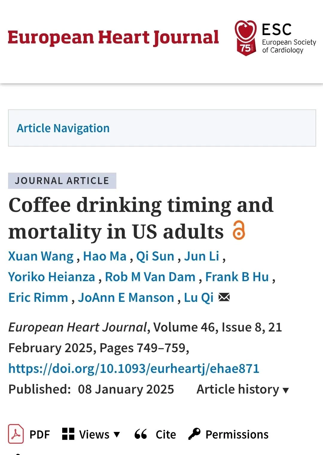 Wang X, Ma H, Sun Q, et al. Coffee drinking timing and mortality in US adults. Eur Heart J. 2025;ehae871. doi:10.1093/eurheartj/ehae871