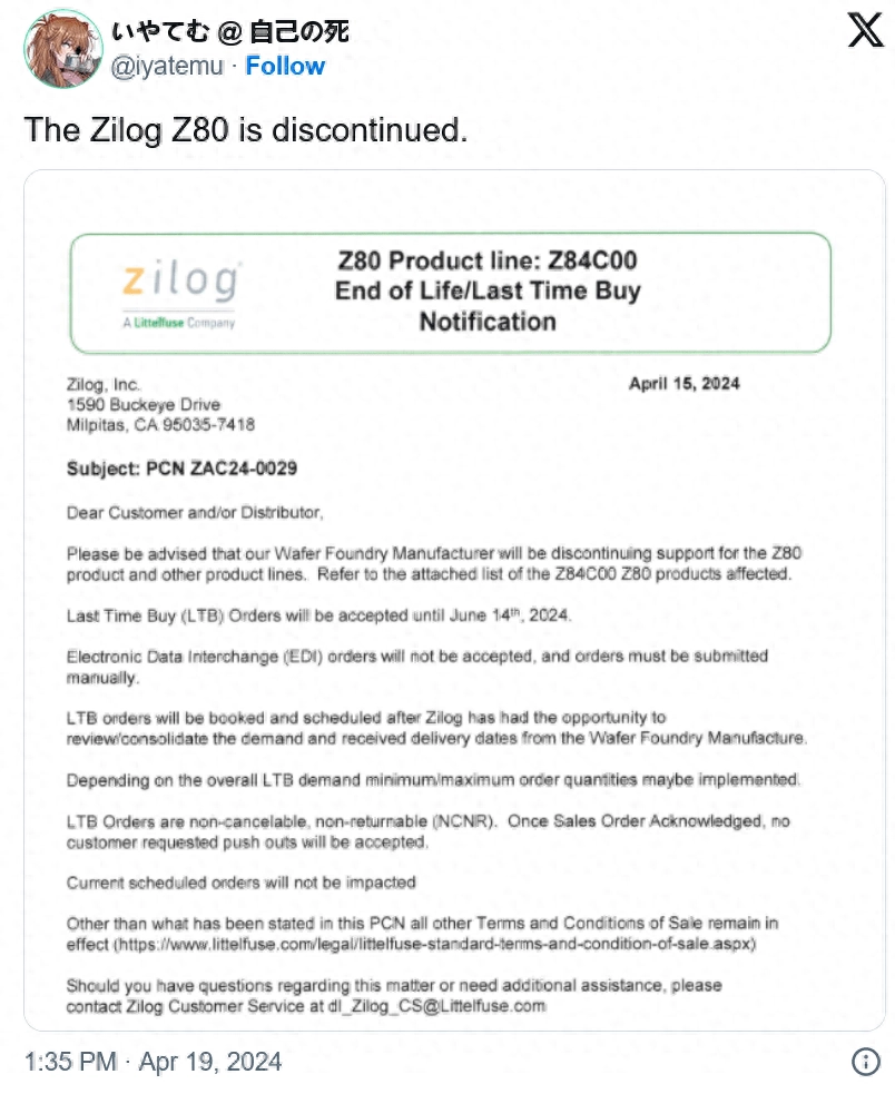 根据 Zilog 的通知,晶圆代工制造商(WFM)将于 6 月中旬停止接受剩余 Z80 产品的”最后购买”(LTB)订单。Zilog 将根据客户的需求处理和安排 Z80 的 LTB 订单,而 WFM 将随后提供实际交货日期。根据 LTB 的总体需求,公司可能会对最低和最高数量提出更严格的要求。