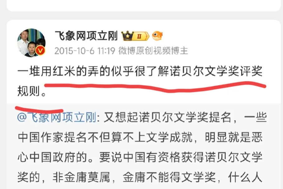记得当初项立刚说一堆用红米的弄的似乎很了解诺贝尔文学奖评奖规则。