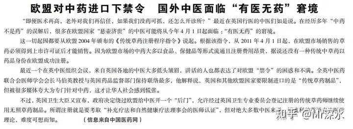 因为“中药马兜铃酸事件”欧盟在2004年颁布了《传统草药注册程序指令》法案,规定中草药不再按照食品管理,改为药品注册制,导致中药在欧洲市场上彻底禁售,还给出了7年的过渡期